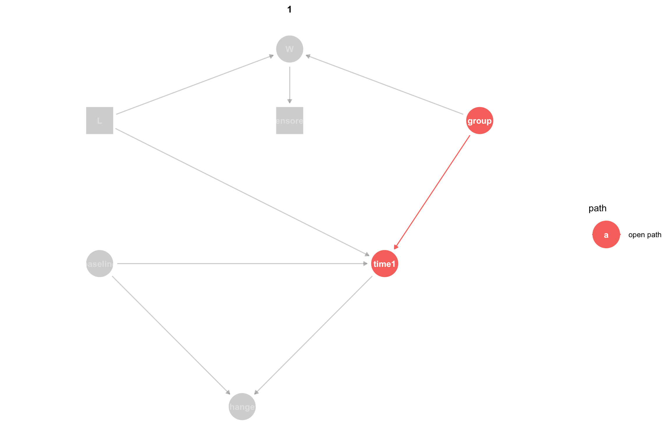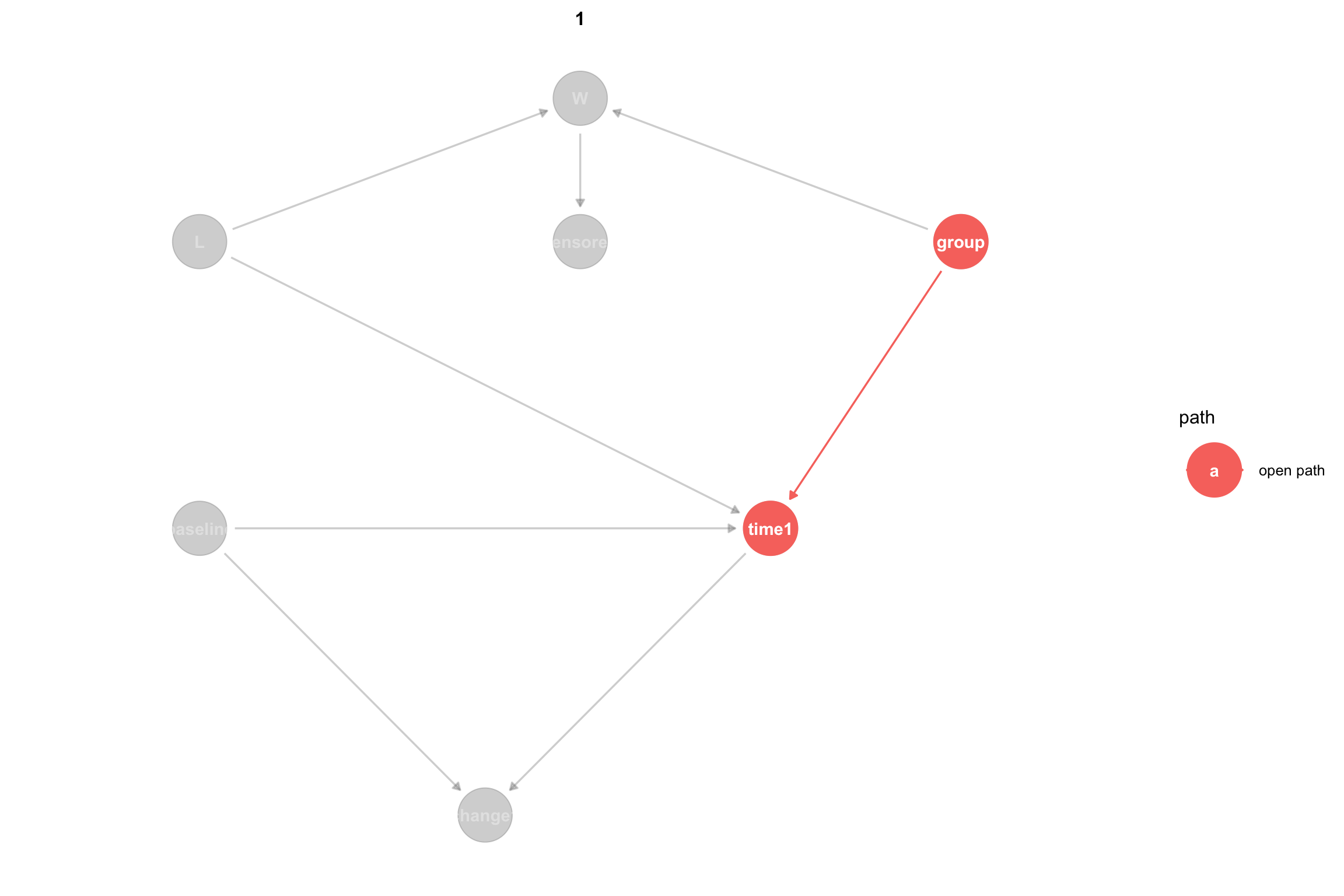 group -> time1 is a causal path that is open, meaning that association can flow through it. group -> W <- L -> time1 is a backdoor path that is closed, because association is blocked since W is a collider on this path. A collider is a node on a path with both arrows pointing toward it. Colliders block the flow of association, as long as we don’t condition or adjust for the collider or a child node of the collider.