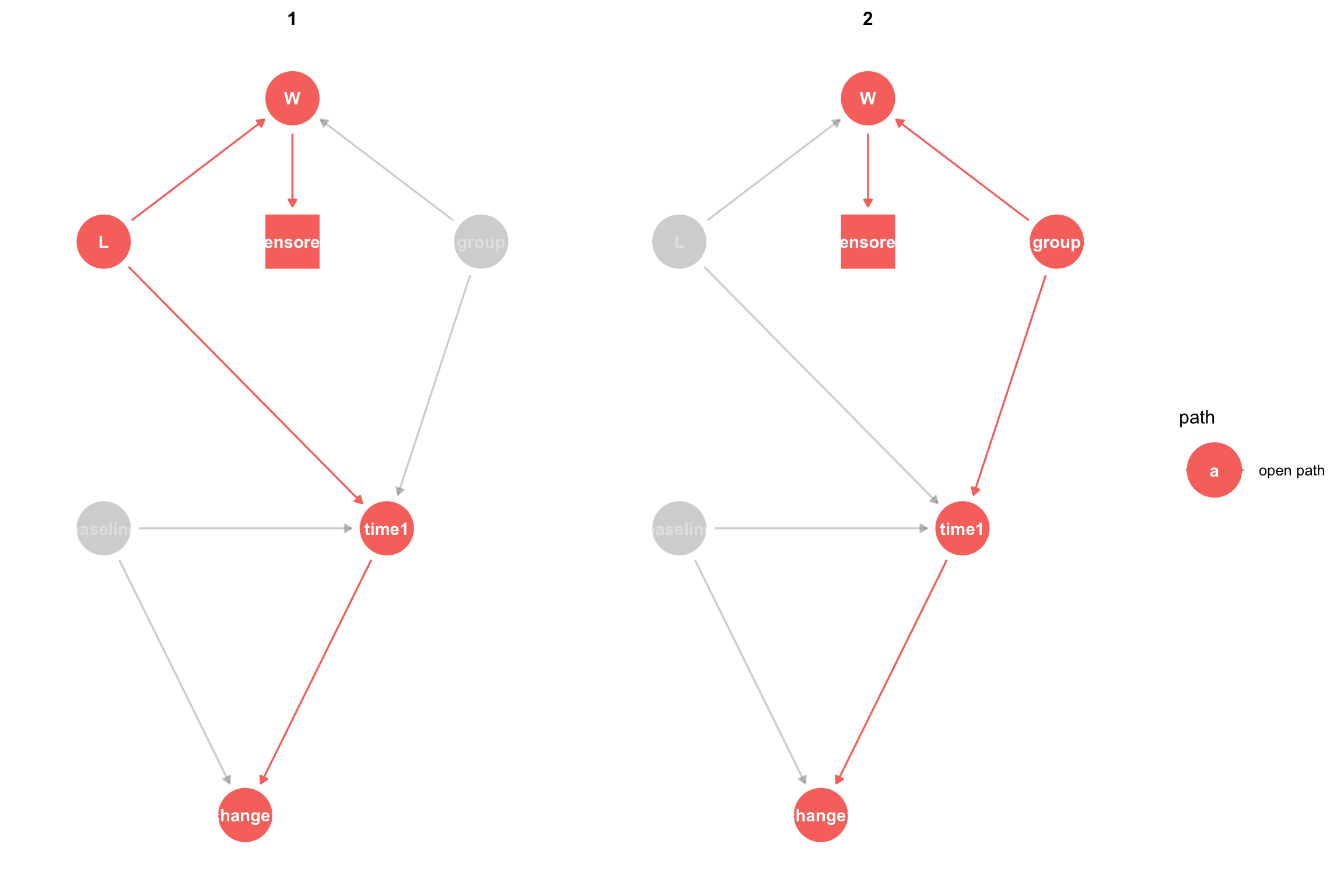 We see that there are 18 paths from group to time2. $open is a boolean list showing whether each path is open or closed. All of these paths are open and since many of these paths are noncausal “backdoor” paths, meaning the arrows do not all point from group to time2 this means that if we measure the association between group and time2 in the data, that association is likely to exhibit bias from confounding. For example, paths 1 through 11 are all backdoor paths that go through censored. A collider is a variable on a path in which both arrows point toward it. As you can see, censored is a collider on every path it appears in. Colliders block association when they are not adjusted, but allow association to flow and bias the analysis when they are adjusted.