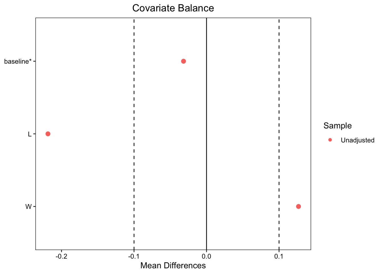 In the uncensored participants L, the prognostic factor that causes better outcomes, is now unbalanced. Participants who in the treated group have a much lower incidence of L. We can see this in a covariate balance plot: